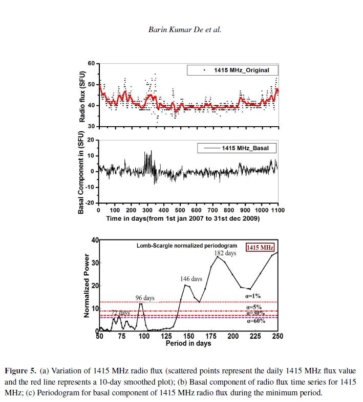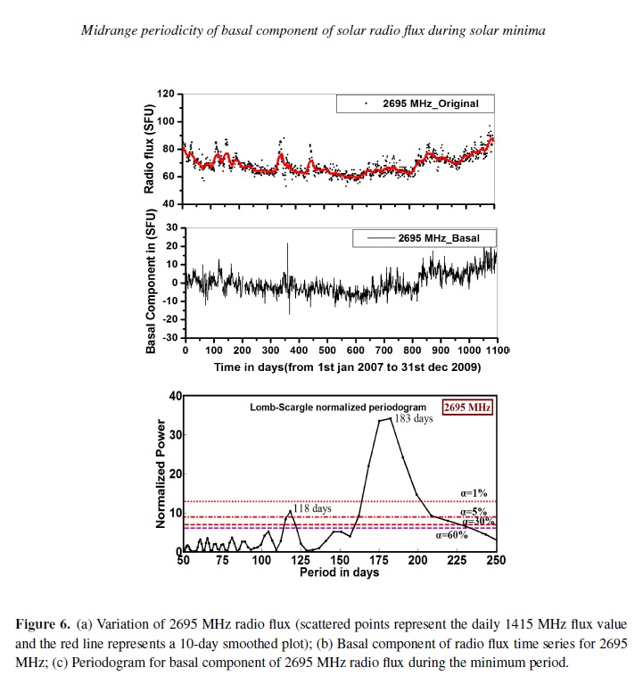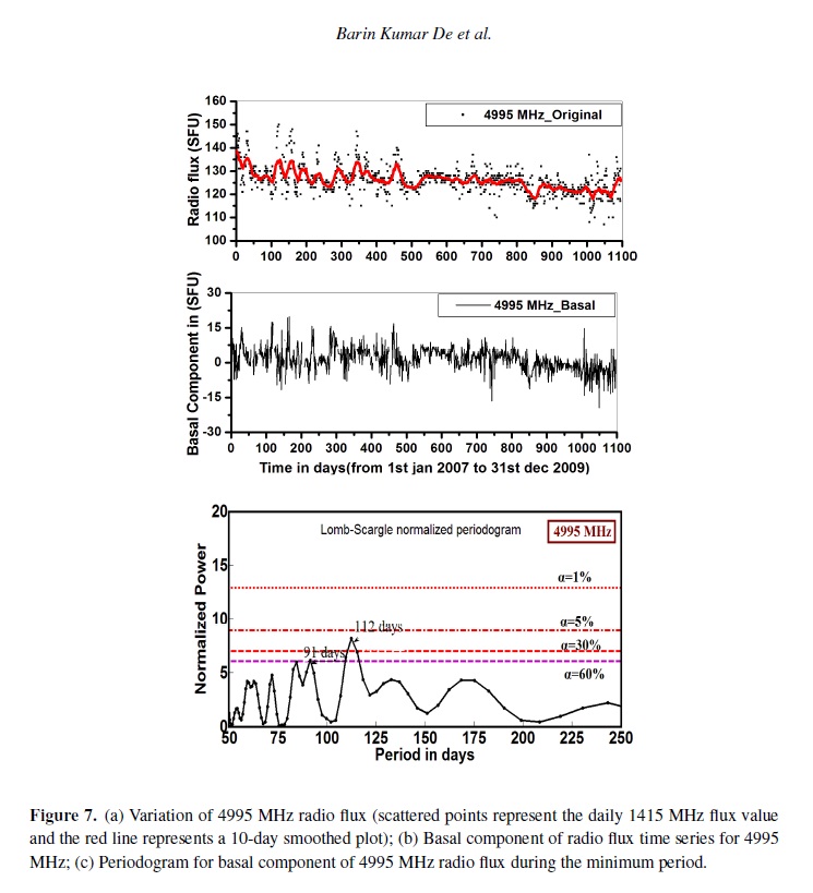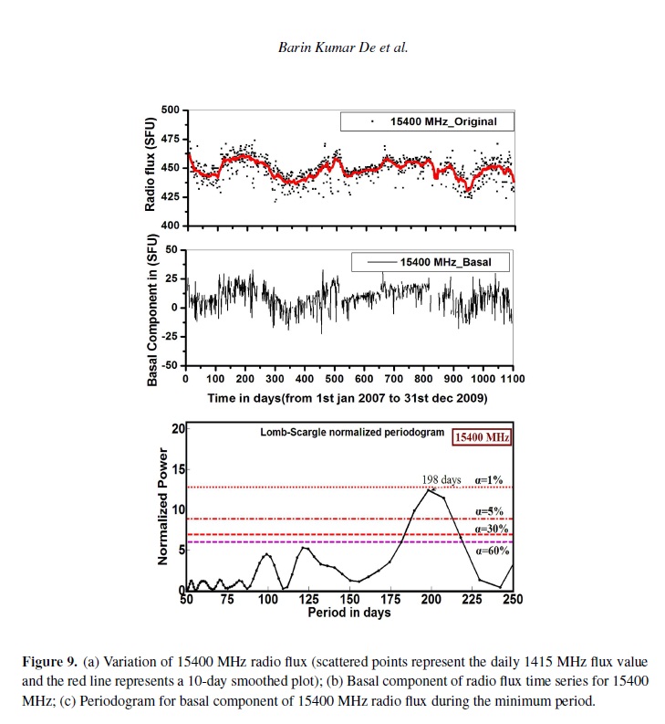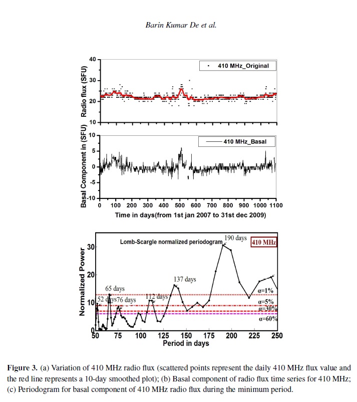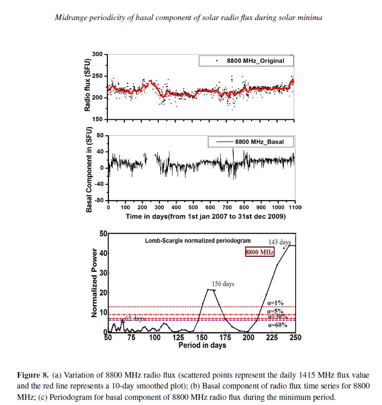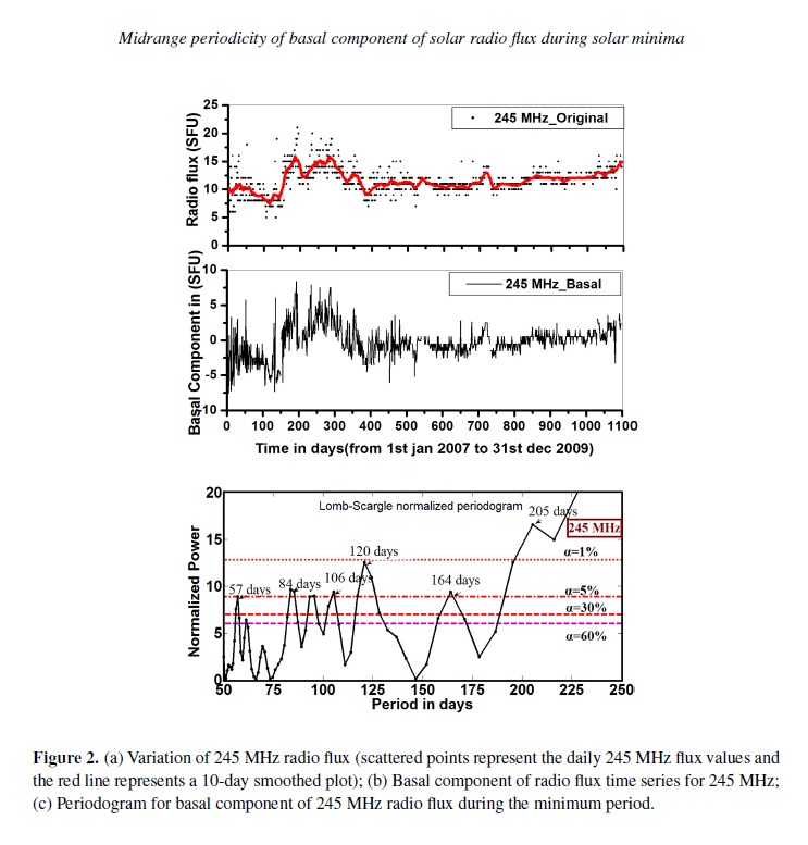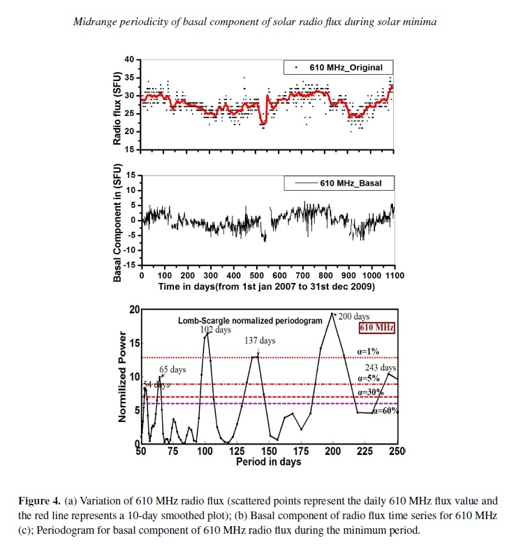Radio observations serve as a powerful tool to study the physical conditions of the radio emitting sources for understanding the characteristics of solar atmosphere. It is also a useful method for understanding the physical properties and the dynamics of the solar corona. It is evident from various experimental observations that the recent 23–24 solar cycle minimum was elongated for much longer time compared to previous minima. In this paper, the mid-range periodicity (in the range of 50–250 days) for non-magnetic components of solar radio flux at eight discrete frequencies viz. 245, 410, 610, 1415, 2695, 4995, 8800 and 15400 MHz during the extended solar minimum period (2007–2009) have been explored using Lomb-Scargle periodogram technique. The periodicities obtained in the mid range (50–250 days) for dierent frequencies during this minimum have been identified with the periodicities within the range of standard deviation obtained from dierent analysis for dierent time span with dierent phase of previous solar cycles by dierent workers. The observations of basal component (non magnetic component of solar radio flux) are interpreted in terms of the internal dynamics of the Sun. The obtained periodicities also provide physical information about the source region of the solar atmosphere.